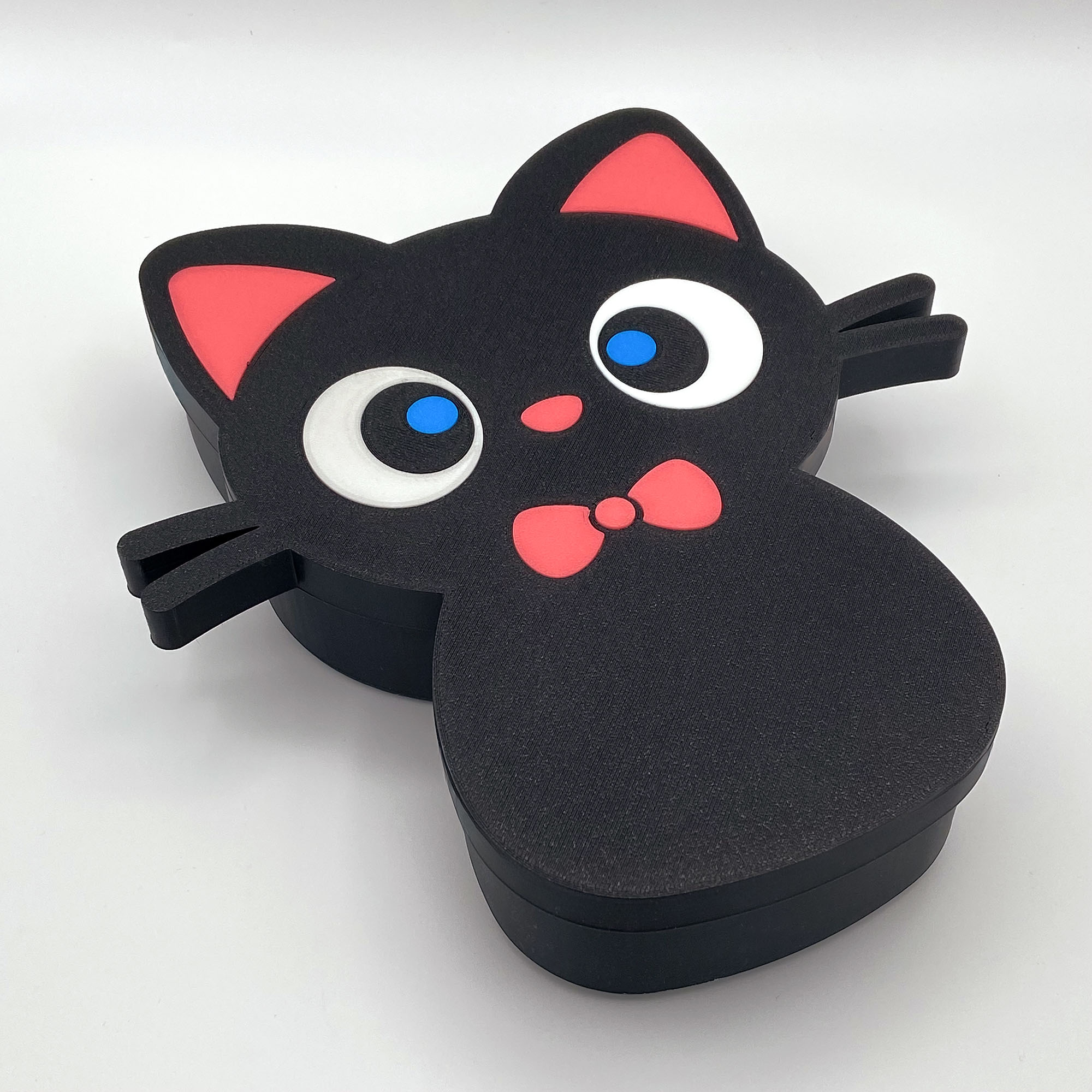 3D Printed Precision Crafted using high-quality 3D printing technology, this box features a distinct, modern texture. The colors are not painted on but are part of the material itself, meaning the vibrant pink ears, blue eyes, and red bow tie won’t chip or fade over time. The matte black finish gives it a sleek look that stands out against white furniture or wood desks.