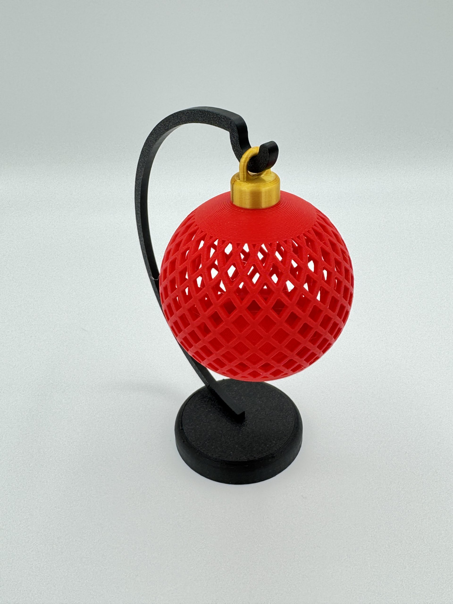 Add a touch of magic to your holiday decor with this Illuminated Christmas Ball. Featuring an intricate open-lattice design that allows the internal light to cast a warm, cozy glow, this ornament is the perfect accent for any room. It comes complete with a sleek, curved black stand, so you can display it instantly on a desk, mantel, or bedside table. Available in a variety of colors to suit your style.